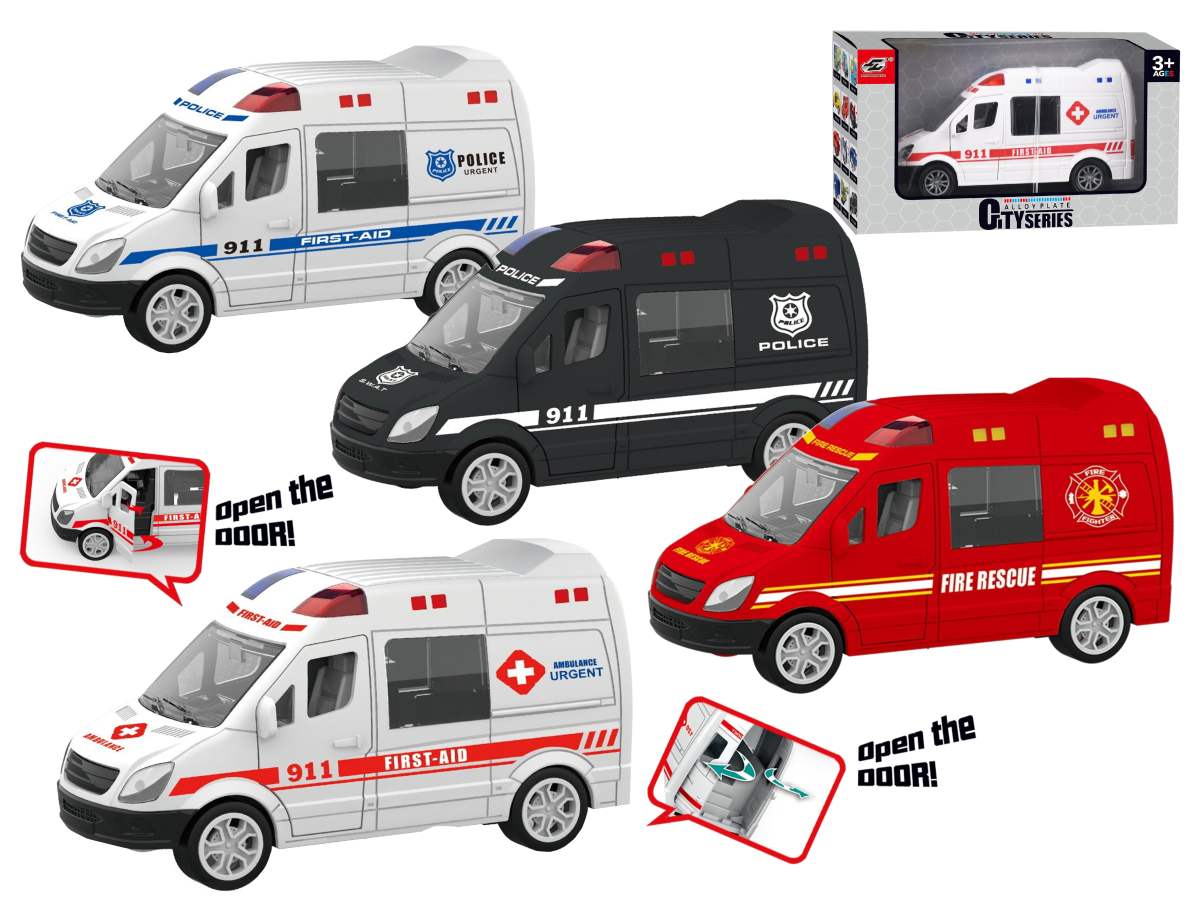 Záchranárska dodávka na zotrvačník s otváracími dverami. Možnosť výberu zo štyroch farieb. Nevhodné pre deti do 3 rokov.
