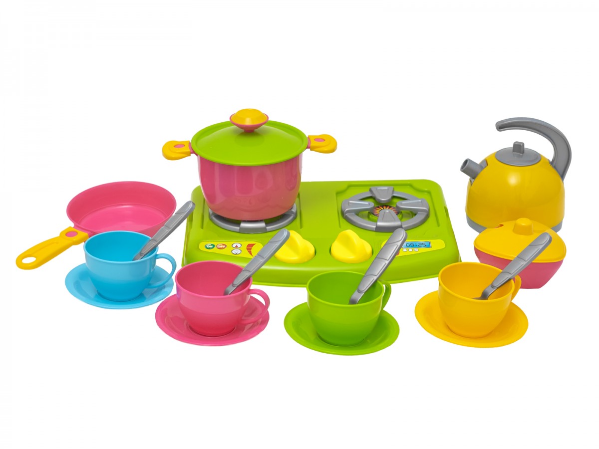 Sada so sporákom, rýchlovarnou kanvicou, panvicou, 2 hrncami, 4 malými taniermi, 4 lyžicami a 4 šálkami.