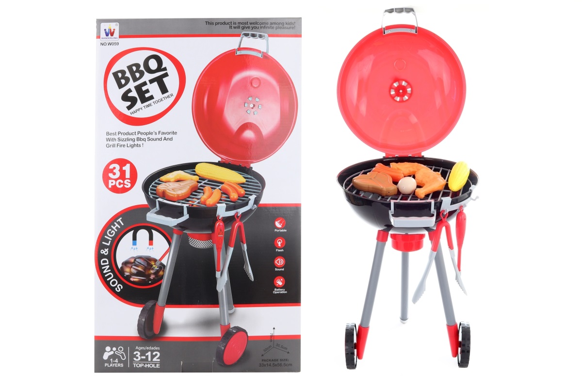 Plastový gril veľký s doplnkami a jedlom na grilovanie. Po zapnutí uhlíkov v grile začnú vydávať zvuk a svietiť. Napájanie na 3"AAA" batérie (nie sú súčasťou). Rozmery cca 33 x 14,5 x 56,5 cm. Vek 3+