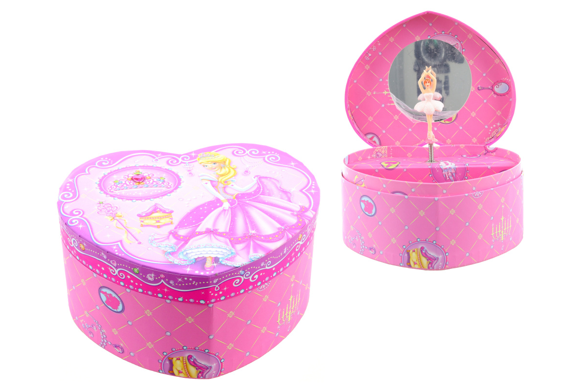 Hracia skrinka šperkovnica truhla. Vnútri špekovnice je zrkadlo a baletka, ktorá po natiahnutí kľúča tancuje a hrá. Veľkosť cca 15 x 13 x 7 cm. Balené v igelitovom sáčku. Výrobok nie je hračka.