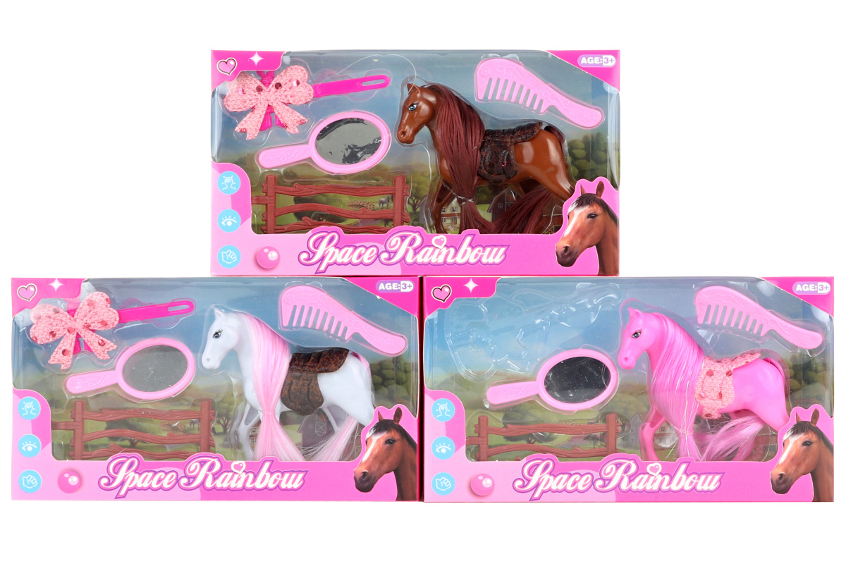 Plastový česací kůň s doplňky. Balení obsahuje koně o velikosti cca 10 x 8,5 cm, hřebínek, zrcátko, sponku a další doplňky. Rozměry balení cca 20 x 11 x 3,5 cm. Věk 3+