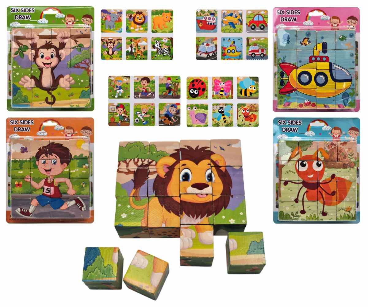 Drevené 16 kusové kocky s rôznymi motívmi. Možnosť výberu zo štyroch druhov - safari, dopravné prostriedky, šport alebo zvieratká. Nevhodné pre deti do 3 rokov.