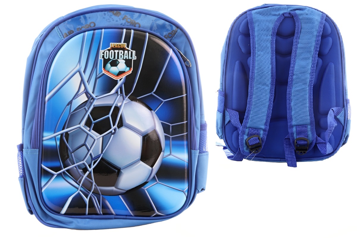 Detský batoh s futbalovým motívom. Batoh má 2 priehradky na zips. Z oboch strán je tiež priehradka na fľašu alebo iné drobnosti. Batoh je pevný a má polstrované chrbát. Nemá hrudný popruh. Rozmery cca 30x35x12 cm. Výrobok nie je hračka.