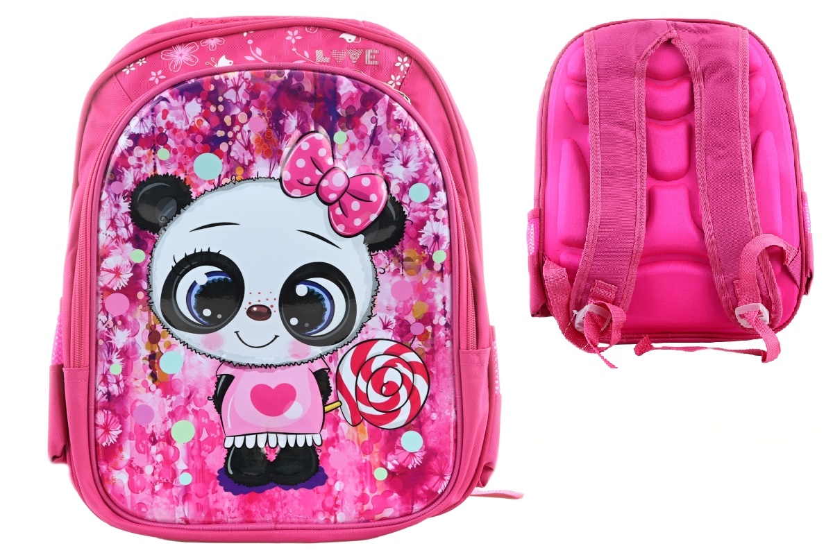 Veselý detský batoh s motívom roztomilej pandy. Batoh má 2 priehradky na zips. Z oboch strán je tiež priehradka na fľašu alebo iné drobnosti. Batoh je pevný a má polstrované chrbát. Nemá hrudný popruh. Rozmery cca 30x35x12 cm. Výrobok nie je hračka.