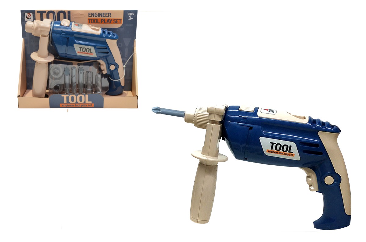 Vŕtačka elektrická set 27 cm. Montážna sada. Okrem vŕtačky sada obsahuje 3 rôzne nástavce na vŕtačku a 2 skrutky s maticami.
