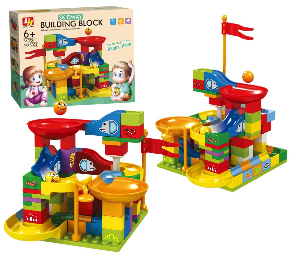 Farebná guličková dráha. Balenie obsahuje 86ks komponentov. Nevhodné pre deti do 3 rokov.