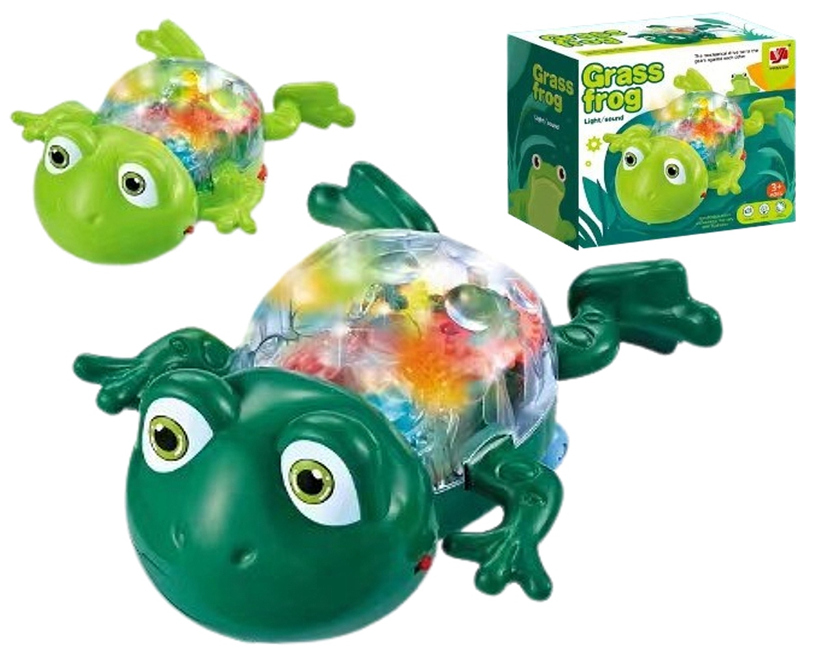 Žabka jazdí, hrá veselú melódiu a svieti. Pri náraze o prekážku zmení smer. Hračka vyžaduje 3ks 1,5V batérií typu AA, ktoré nie sú súčasťou balenia.