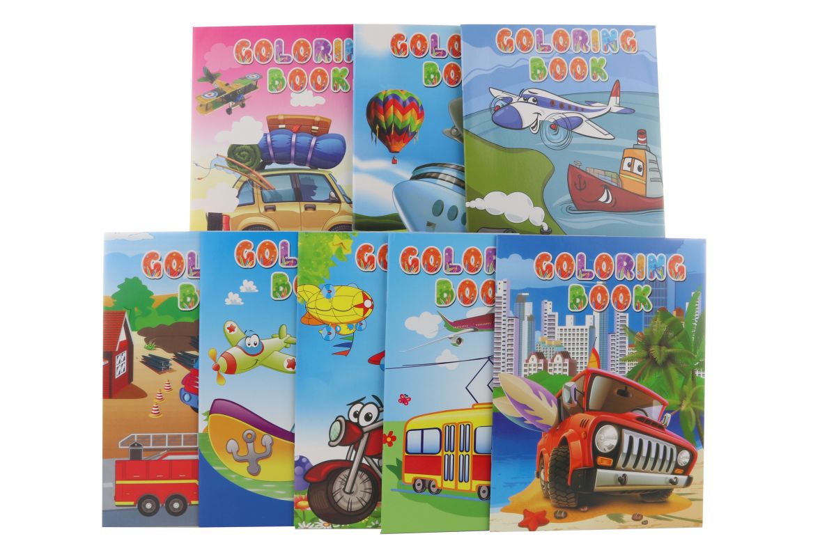 Omaľovánky s obrázkami rôznych dopravných prostriedkov. Rozmery cca 28 x 21 cm