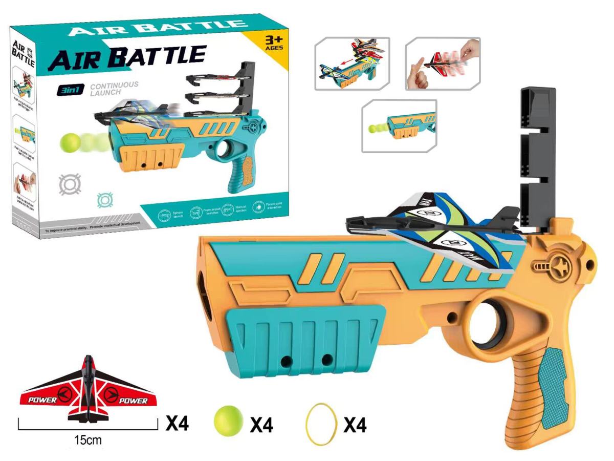 Pištoľ 3v1. Balenie obsahuje pištoľ, 4 plastové guľôčky, 4 lietadielka (15cm) a gumičky. Nevhodné pre deti do 3 rokov.