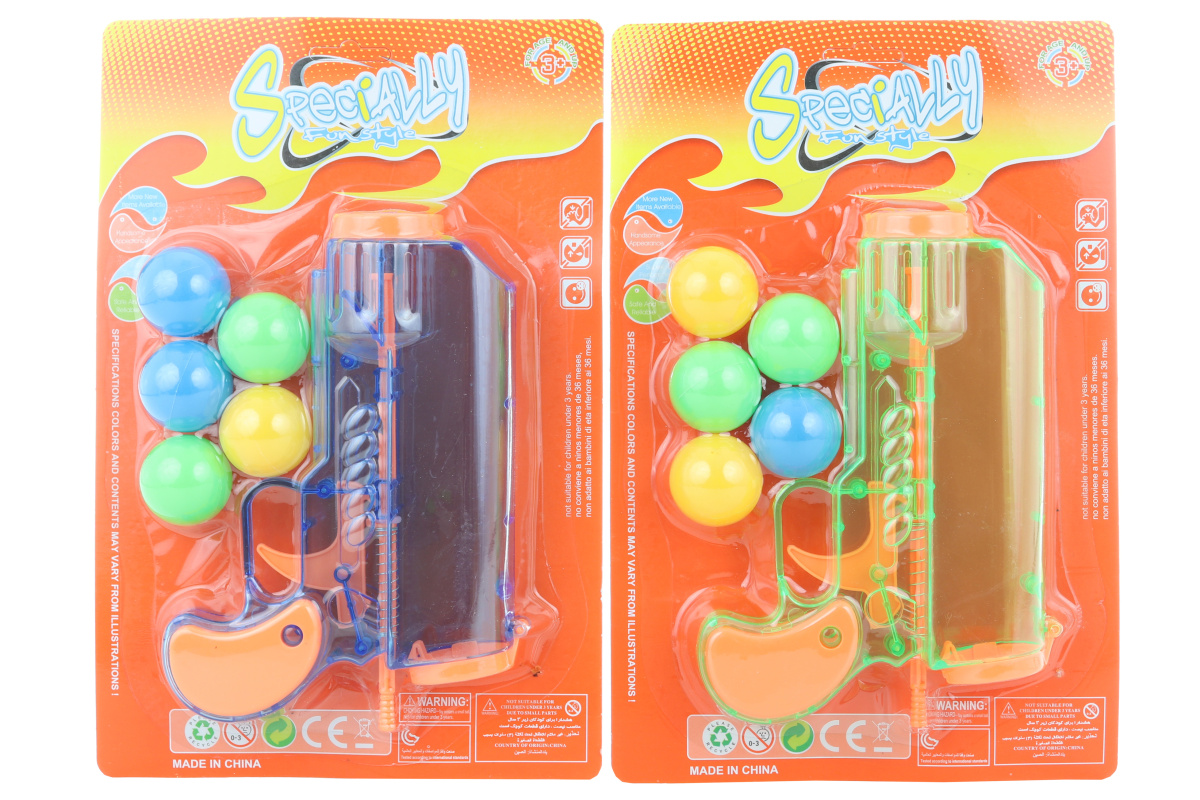 Vystreľovacia pištoľ o veľkosti cca 18cm vystreľuje plastové loptičky. Balenie obsahuje pištoľ a päť loptičiek. Vek 3+
